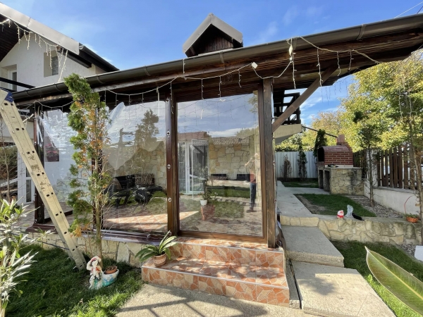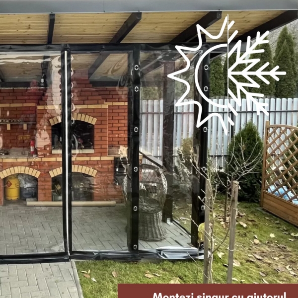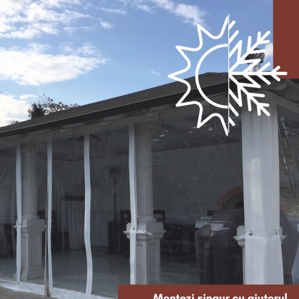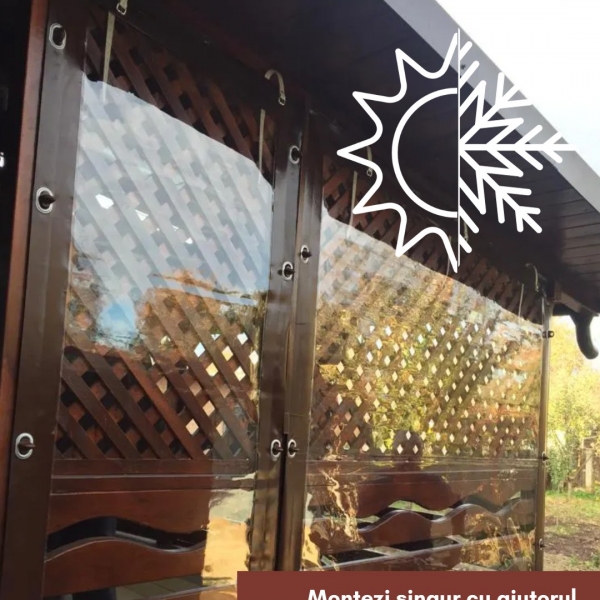 Sistemul de inchidere a terasei cu folie transparenta, cu capse si bride va poate ajuta atunci cand temperaturile sunt scazute, pe timp de ploaie, zapada sau vant. Acest sistem este foarte usor de instalat atat pentru foisoare cu structura din lemn cat si pentru terase.